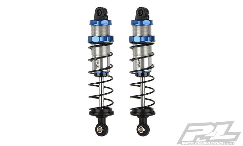 This is a pair of Pro-Line Front Pro-Spec Shocks (Pre-Assembled). The next generation of Pro-Line Shock Technology has arrived: Pro-Line Pro-Spec Shocks! Now available Pre-Assembled, just fill with your choice of shock oil (not included). Every last detail has been refined to give you the best performing and best looking Shocks ever made. The Pro-Spec Shocks are a 12mm Big Bore design with a Single Low Friction X-Ring Seal. The Pistons and Shaft Guides are made from Silky Smooth White Delrin for Low Stiction and the 3.5mm thick Shock Shaft is Hard Chrome Coated, just like full scale racing shocks.